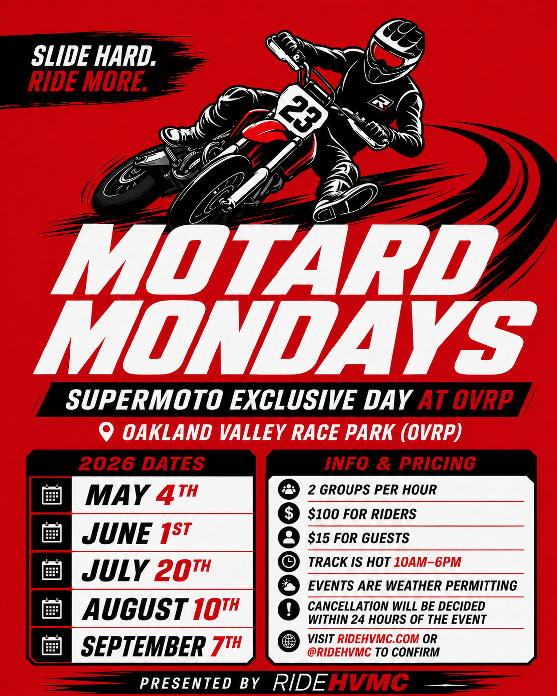 Visit ridehvmc.com/motardmondays or check @ridehvmc to confirm.